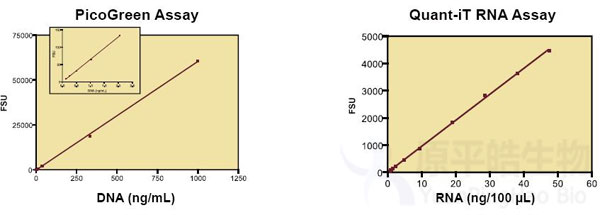 使用荧光检测模块, Modulus™ 能够完成高灵敏度的DNA/RNA定量检测, 可应用PicoGreen或Hoechst染料定量检测DNA, 应用RiboGreen或Quant-iT RNA染料定量检测RNA. 使用PicoGreen染料, 在微量检测皿100ul检测体积下, 可检测低至4.5pg的dsDNA. - 蛋白定量检测