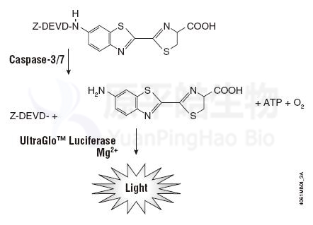将Caspase的酶促反应与荧光素酶发光反应相偶联,即可使用检测发光强度的方法来检测Caspase 酶的活性。